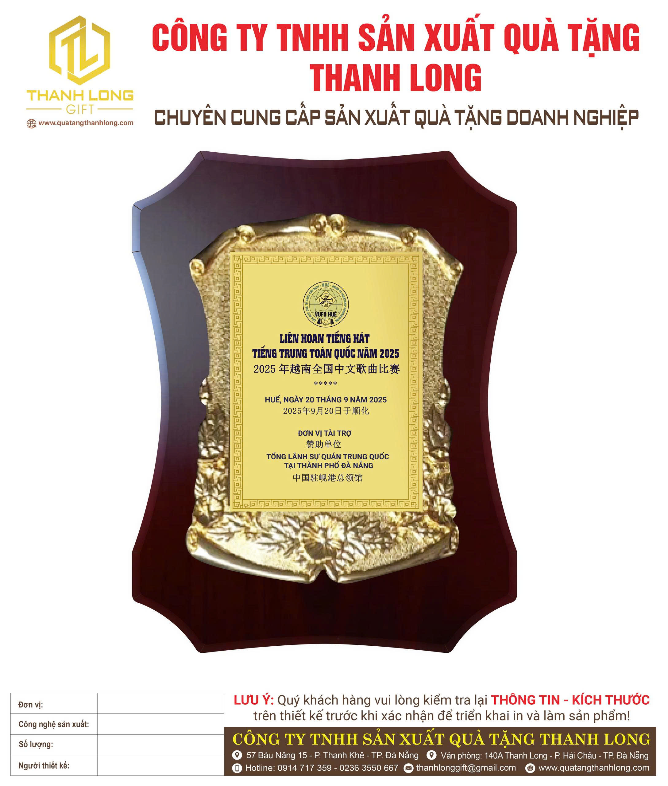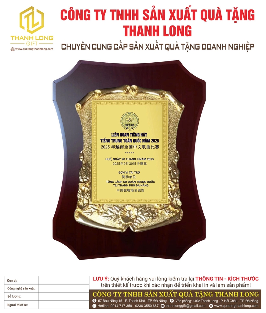 Vui lòng liên hệ với chúng tôi qua SĐT: 0914 717 359 hoặc Email: thanhlonggift@gmail.com ngay hôm nay để đặt hàng và sở hữu Bảng Vinh Danh cao cấp, góp phần tôn vinh những giá trị xứng đáng! Chúng tôi luôn sẵn sàng hỗ trợ bạn trong việc thiết kế và in ấn nội dung theo yêu cầu.