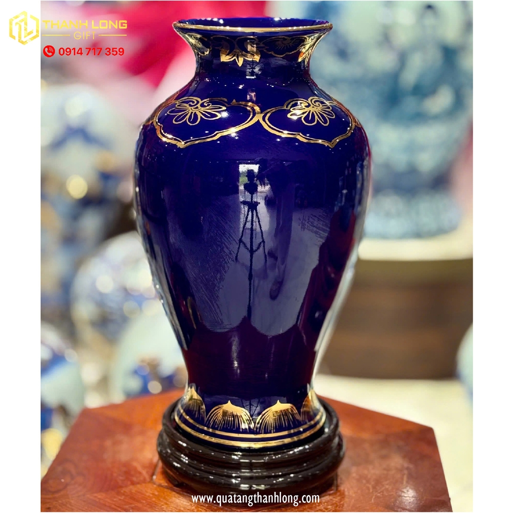 Bình hoa được chế tác từ gốm sứ xanh tím cao cấp, phủ men bóng mịn, cho bề mặt sáng đẹp, bền màu theo thời gian. Toàn bộ họa tiết hoa sen trên thân bình được vẽ tay thủ công kết hợp nhũ vàng tinh xảo, tạo nên vẻ đẹp sang trọng, cổ điển và rất phù hợp với không gian trang trí cao cấp.