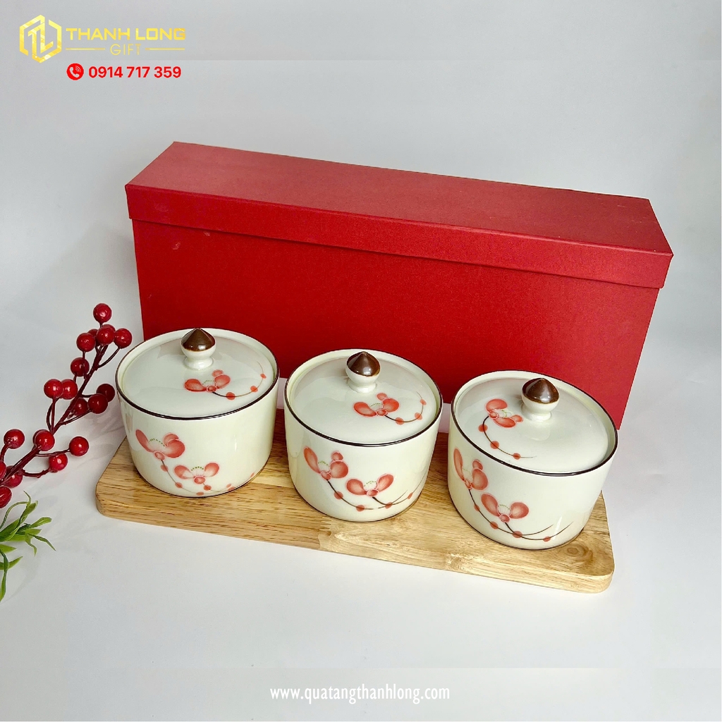 Bộ Khay Sứ Hoa 3 Hũ - In logo đơn vị.