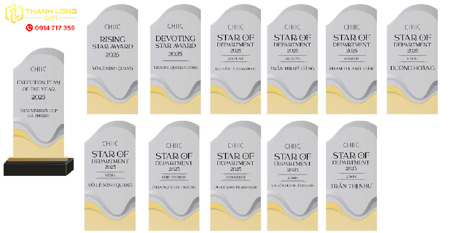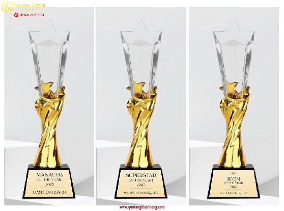 CÚP NGÔI SAO - PHA LÊ ĐẾ ĐEN 3 MÀU (VÀNG – BẠC – ĐỒNG) - in ấn thiết kế theo nội dung yêu cầu của khách hàng.
