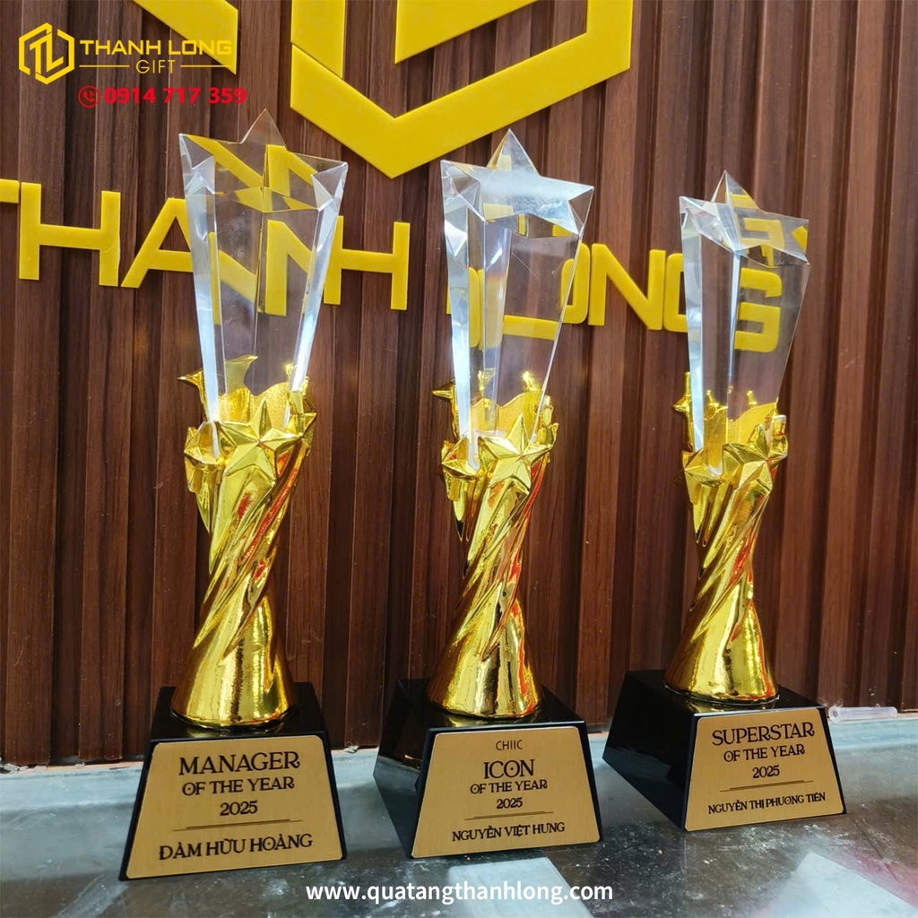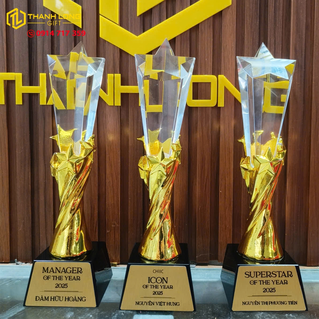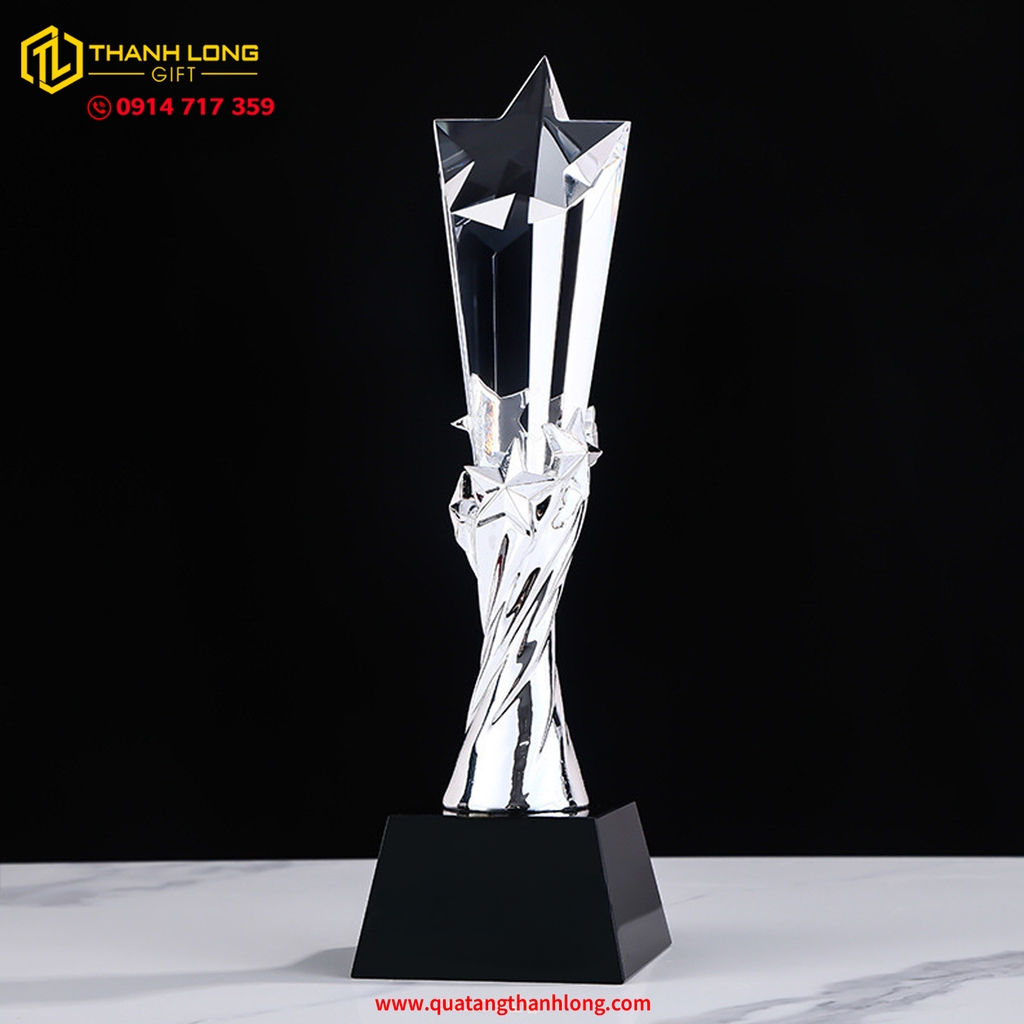 CÚP NGÔI SAO - PHA LÊ ĐẾ ĐEN 3 MÀU (VÀNG - BẠC - ĐỒNG) - In ấn thiết kế theo nội dung yêu cầu của khách hàng