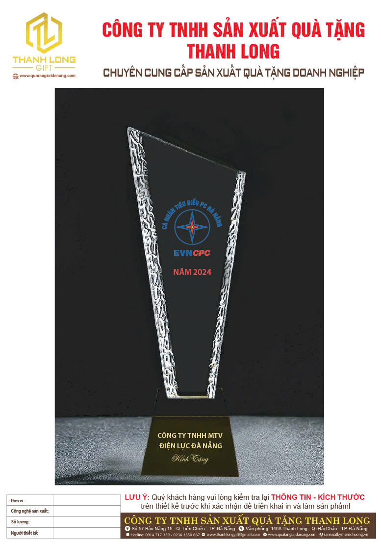 - Bề mặt pha lê trong suốt, cho phép in UV hoặc khắc laser nội dung tùy chỉnh như tên người nhận, chức vụ, thành tích, logo công ty và lời tri ân.