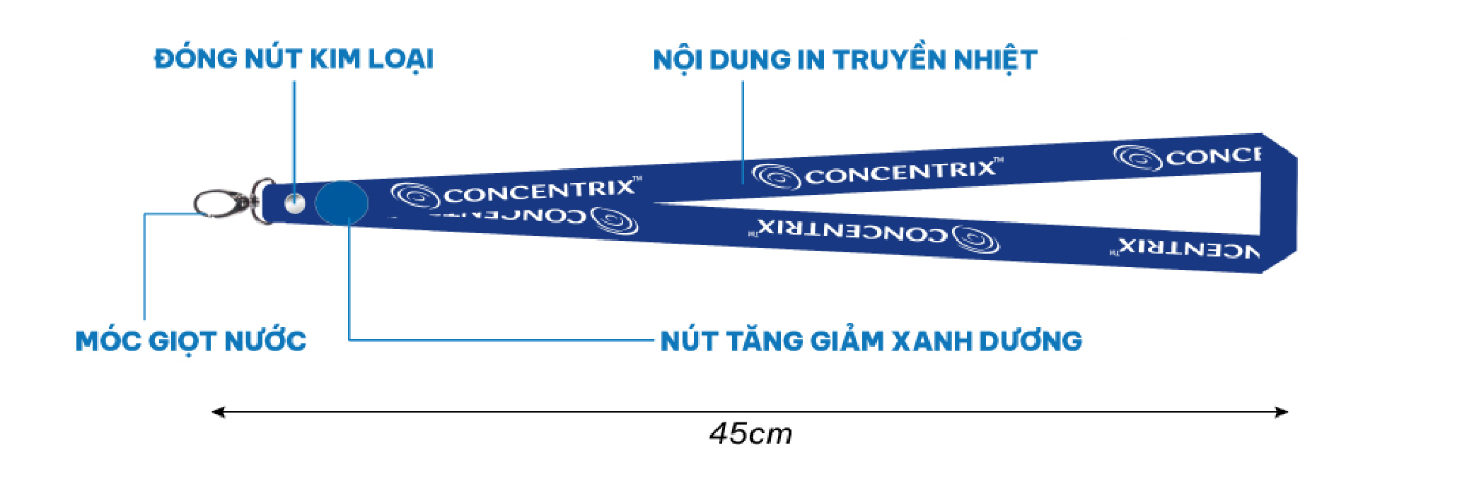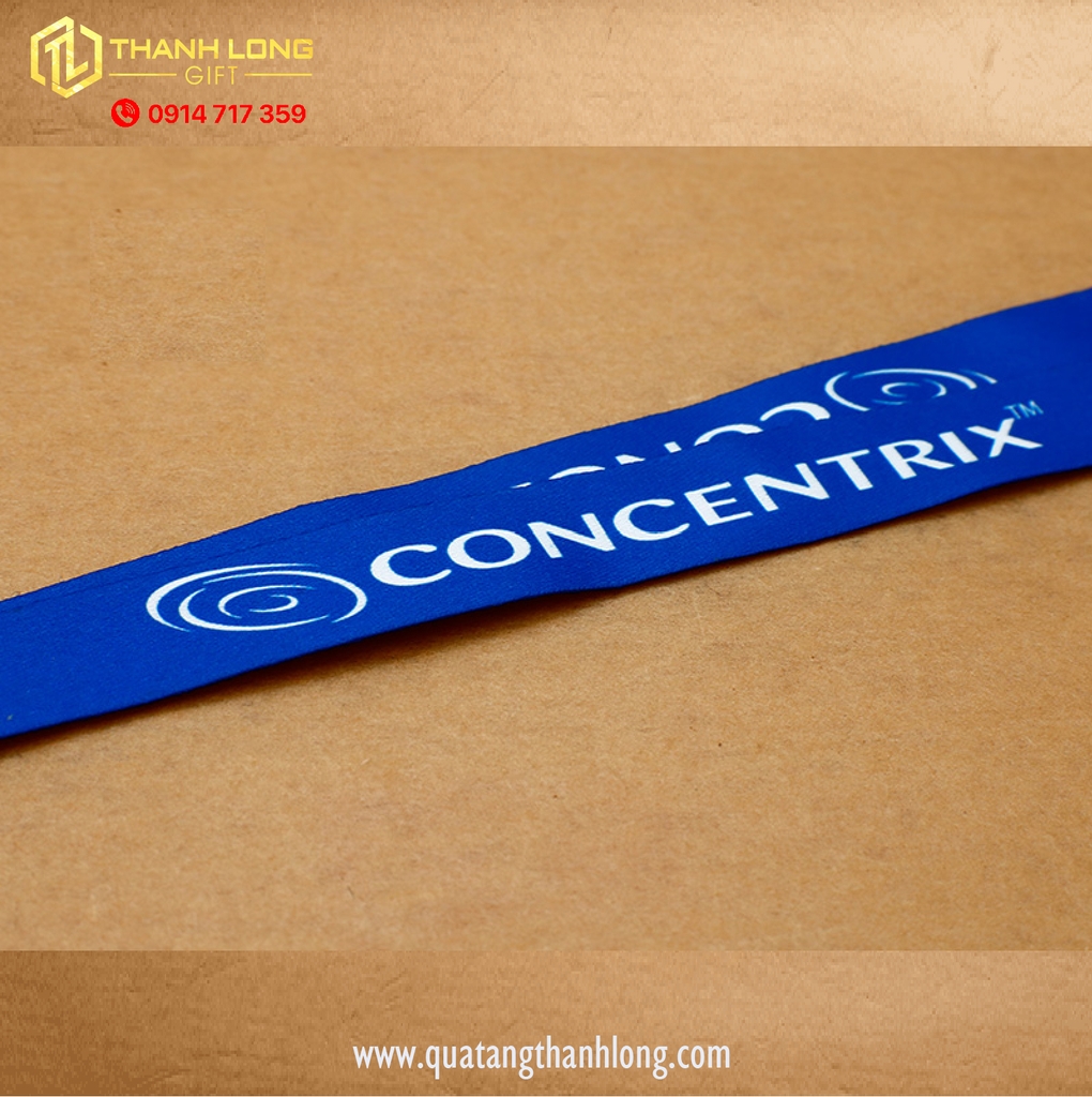 Dây đeo thẻ mẫu CONCENTRIX, là loại dây dùng chất liệu vải satin cao cấp với công nghệ truyền nhiệt tạo nên hình ảnh logo sắc nét. Phần đầu dây được đóng nút kim loại thay cho đường may, sử dụng móc kim loại xi bạc (móc giọt nước), gắn nút tăng giảm độ dài màu xanh dương (nút tăng giảm có nhiều màu sắc).