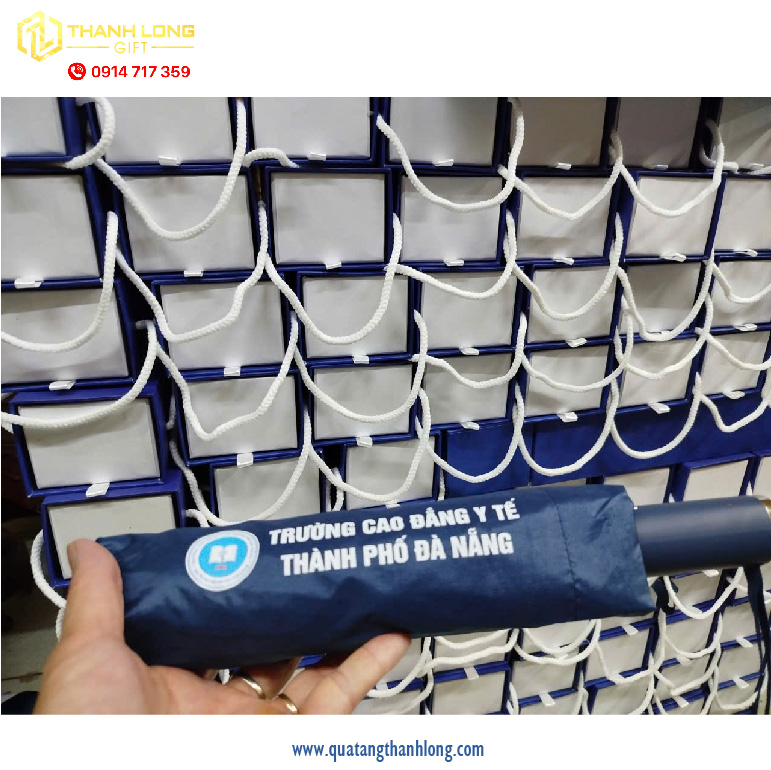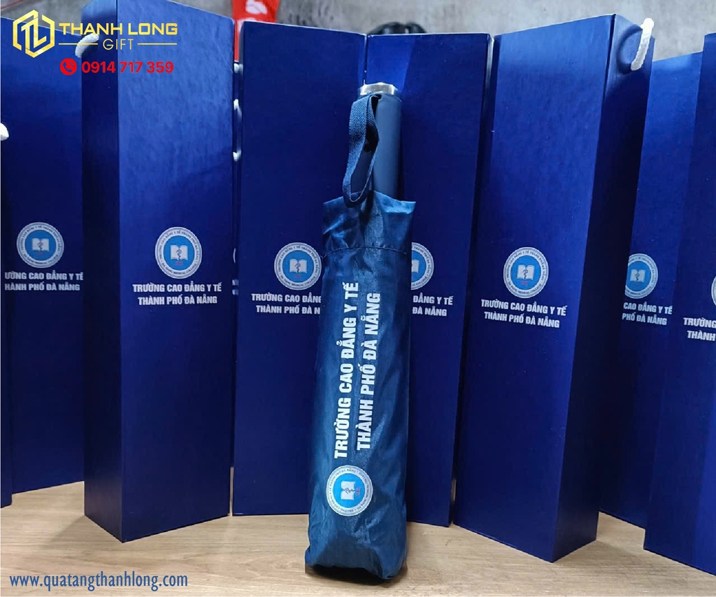 Bộ quà tặng dù cầm tay in logo – hộp quà quai xách hợp tác giữa Công ty Quà tặng Thanh Long và Trường Cao đẳng Y tế Đà Nẵng là minh chứng cho sự kết hợp giữa tính thẩm mỹ, giá trị sử dụng và hiệu quả quảng bá thương hiệu.