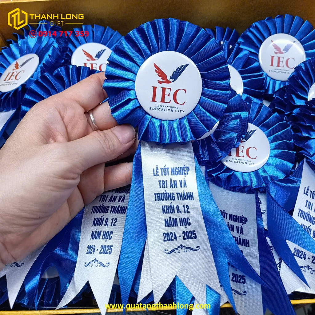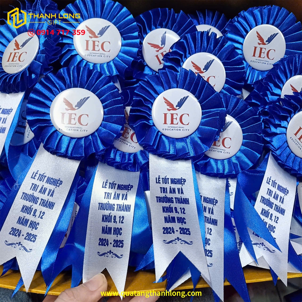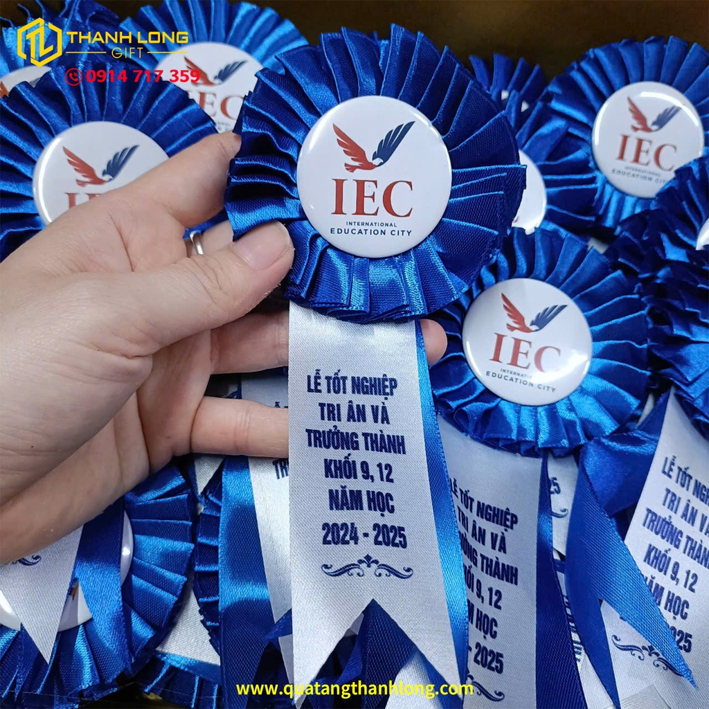 Hoa cài áo lễ trao giải được thiết kế với tông xanh dương chủ đạo gam màu của sự chuyên nghiệp, tin cậy và thanh lịch. Phần đuôi nheo nằm ở trung tâm không chỉ là điểm nhấn thẩm mỹ mà còn là nơi in logo, tên sự kiện hoặc thông điệp riêng, giúp tăng tính nhận diện và tạo ấn tượng chuyên nghiệp cho chương trình.