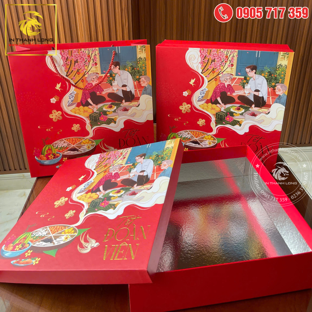 | HỘP QUÀ TẾT Kích thước: 33x33x10cm Hộp âm dương cao cấp, giấy chipbor 1,7 ly bồi áo couche in offset nhiều màu. TÚI QUÀ TẾT Kích thước: 33,5x33,5x10,5cm Chất liệu: C250gsm In offset, bế khuôn, cán màng, đục lỗ, xỏ dây dù thành phẩm. |