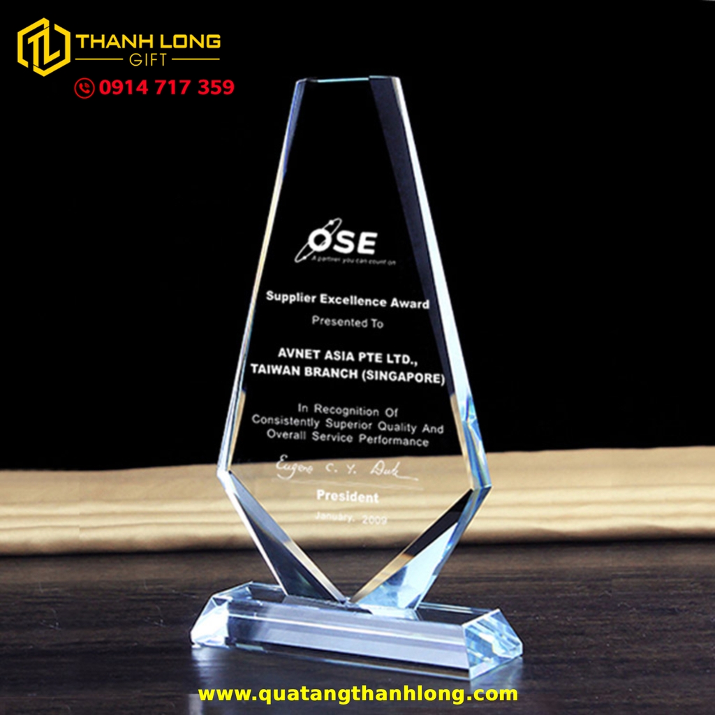 - Bề mặt pha lê trong suốt, cho phép in UV hoặc khắc laser nội dung tùy chỉnh như tên người nhận, chức vụ, thành tích, logo công ty và lời tri ân.
