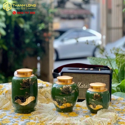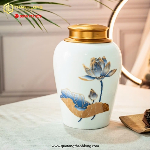 lọ chè sứ, lọ chè sứ in hoa sen, lọ chè sứ in logo, lọ chè sứ cao cấp, lọ đựng chè, quà tặng doanh nghiệp, quà tặng khách hàng, quà tặng lễ tết, đồ trang trí phòng khách, đồ trang trí phòng trà, hoa sen ánh kim, sứ in logo, in logo lên lọ chè.