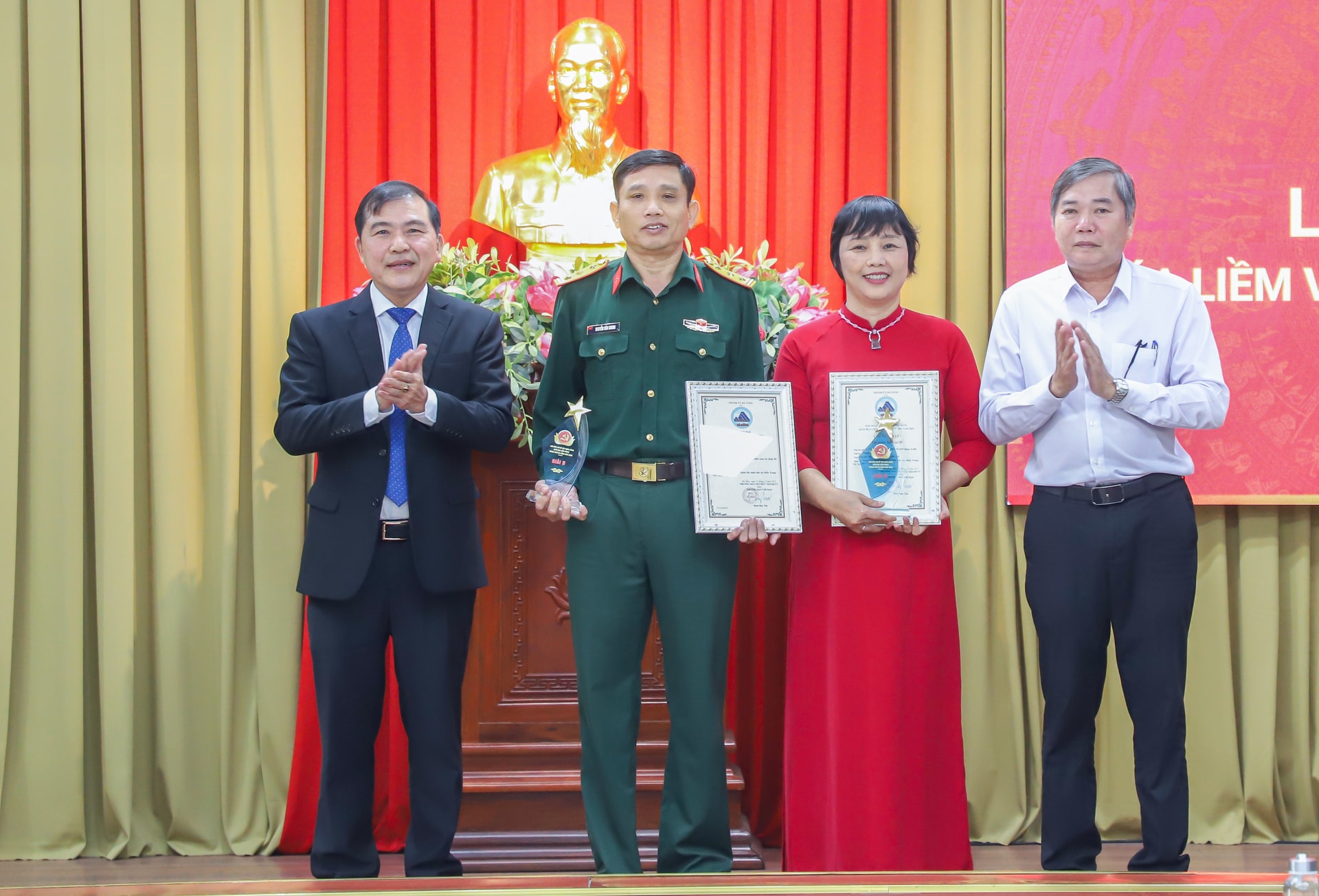 Phó Bí thư Thường trực Thành ủy Nguyễn Đình Vĩnh (bên trái) và Trưởng ban Tổ chức Thành ủy Đoàn Duy Tân (bên phải) trao Giải Tập thể xuất sắc cho Báo và phát thanh, truyền hình Đà Nẵng và VTV8 Đà Nẵng. Ảnh: NGỌC PHÚ